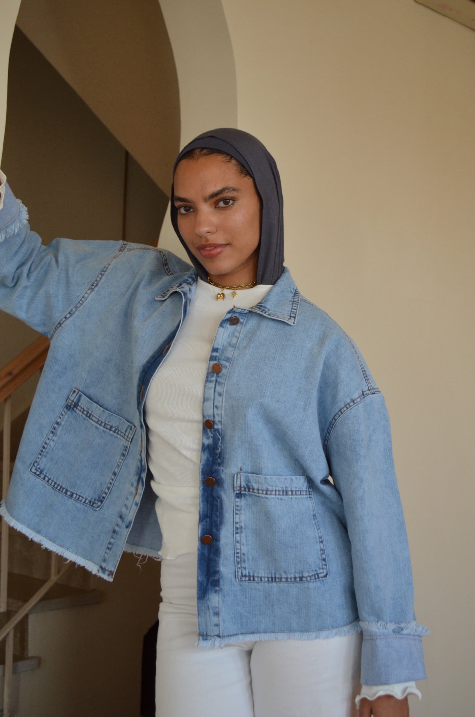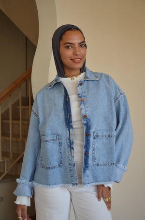 •Design: Features a relaxed-fit denim jacket with frayed edges and oversized pockets for a trendy look.